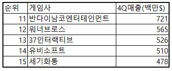 15위권에는 중국 회사가 2곳이다. 세기화통과 37인터랙티브로 15위세기화통은 게임과 자동차 부품을 만드는 회사로, 모바일게임에 중점을 두고 있고, 13위 37인터랙티브는 2,000명이상의 직원이 모바일게임에 주력하는 중국 탑5 안에 드는 회사다.