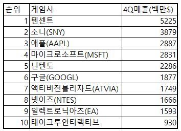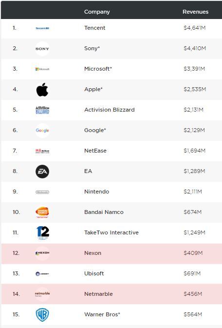 올해 초 뉴주가 발표한 2019년 매출 기준 글로벌 게임사 탑10은 텐센트, 소니, MS, 애플, 블리자드, 구글, 닌텐도, 넷이즈, EA, 테이크투의 순이었다. 그리고 유비, 반다이남코, 워너브로스, 넷마블, 스퀘어에닉스가 탑15에들었다. 인사이드 머니 자료와 큰 차이는 나지 않는다.