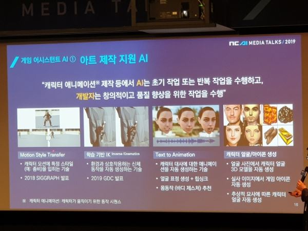 엔씨 AI센터가 최근 집중 하는 분야는 '텍스트 투 애니메이션'이다. 게임 속 캐릭터들의 얼굴과 몸동작의 개발을 AI가 대신해준다는 내용이다. 얼굴 표정 생성이나 립싱크 장면 등에 대한 애니메이션을 자동으로 보여주는 것인데, 내년 쯤 결과를 보여줄 예정이다.