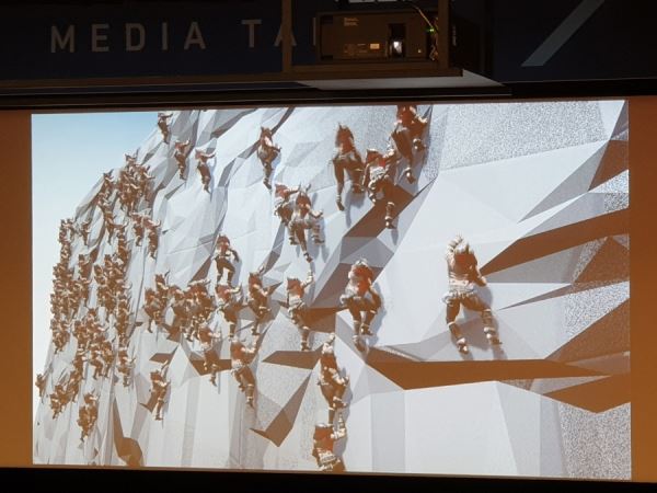 엔씨가 개발중인 '학습기반 IK'는 캐릭터가 그 동작을 할 수 있도록 돕는다. 현장에서는 캐릭터가 절벽을 오르는 장면이 시연됐다. 벽을 타는 동작을 부드럽게 하려면, 관절을 움직여야 한다. 절벽 지형처럼 변화가 많은 지역에서는 동작을 수작업을 통해 맞춰 줘야 하는데, 이런 것을 기계학습을 통해 만들어 준다. 100명이 동시에 올라가도 처리가 가능하다는 것이 이재준 센터장의 설명.