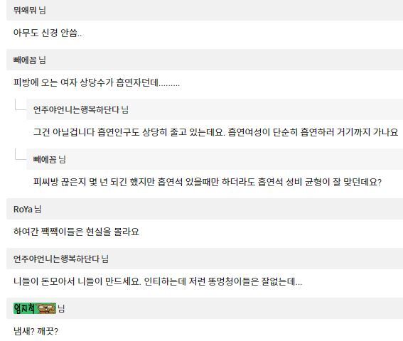 클리앙의 한 사용자는 "여자 손님 많을 때도 20% 안 넘는다. 자리 화장실 둘 다 더럽게 쓰는데 뭔 깨끗한 공간을찾는지"라고 했고, 다른 사용자들도 "여자라고 추파 던진다니...무슨 히키코모리가 나갔을 때의반응을 상상하고 쓴 글인가"라며 게시물의 내용을 부정하는 의견을 남겼다. 아울러 "돈 되면.....하지말라고 해도 하는게 시장 원리"라며 여자 전용 PC방이없는 이유를 설명했다. 1년 후에 인티즌에는 '여성전용 PC 방에 발작하는 쿵쾅이들.jpg'라는 게시물이 올라오며 여성 전용PC방에 대한 논란이 이어졌다.