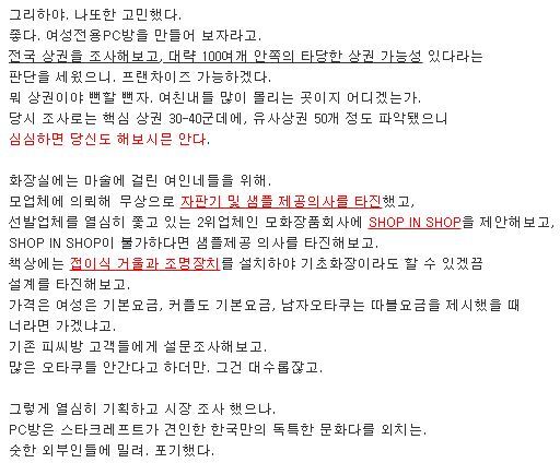 좀 더 시기를 거슬러 올라가면 실제 여성 전용 PC방 오픈을 고민한게시물도 있다. 약 2007년 창업전문가라는 닉네임의 한네티즌이 여성들을 위한 제품 및 샵인샵 제안을 하는 등 열심히 여성 전용 PC방을 기획하고 시장조사를했으나, 'PC방은 스타크래프트가 견인한 한국만의 독특한 문화'라는사실 앞에 포기했다는 내용이다.