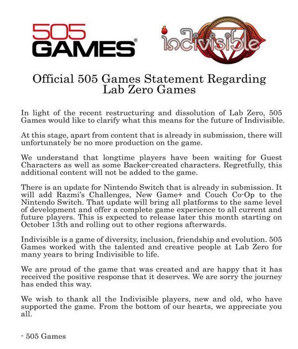 2D 플래포머 게임인 ‘인디비지블’, 2D 대전 게임 ‘스컬 걸즈’ 등을 개발했던 랩제로 게임즈가 대표의 성희롱과 폭언으로 개발자들이 대량 이탈하면서 사실상 업데이트와 개발이 중단됐다. 지난 10월 10일(미국 시각), ‘인디비지블’의 퍼블리셔인 505 게임즈는 ‘‘인디비지블’의 여정이 끝났다. 게스트 캐릭터나 후원자 캐릭터 등 향후 업데이트는 진행되지 않을 것’이라고 밝혔다.