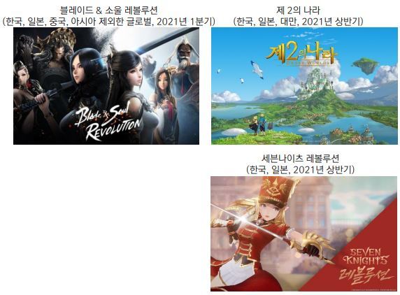 이 외에도 2021년 1분기에는 블레이드 & 소울 레볼루션 (한국, 일본, 중국, 아시아 제외한 글로벌), 2121년 상반기 제 2의 나라(한국, 일본, 대만), 세븐나이츠 레볼루션(한국, 일본) 등을 비롯하여 다수의 신작이 출시 예정이다.