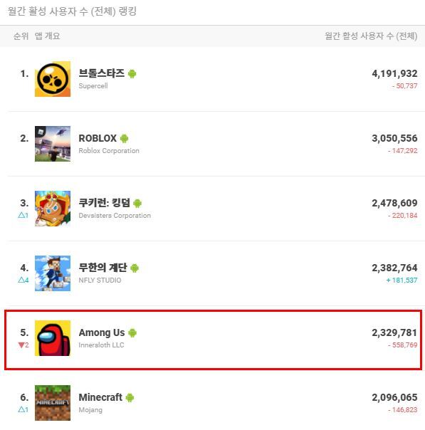한때 '어몽어스'는 월간활성사용자수(MAU)가 8백만 명에 육박했을 정도로 인기게임이었지만 몇 달 사이 사용자가 많이 빠졌다. 크게 보면 1/4 정도로 줄어든 셈. 특이하게도 이 게임은 남여 성비가 비슷하다. 여성들이 많이 하는 게임일수록 스테디셀러게임인 경우가 많다. 특이하게도 2019년만해도 10%에도 미치지 못했던 여성 사용자의 게임이 인기를 얻자 여성 비율이 45%까지 늘어났다. 한편 10대가 가장 많을 것 같지만 앱에이프 자료에 다르면 40대 남녀가 가장 많은 비율을 차지하고 있다.