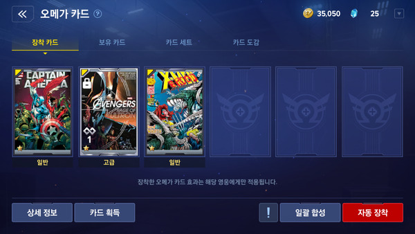 코스튬과 더불어 뽑기 항목인 오메가 카드 역시 전투력 상승을 위한 좋은 장치다. 코스툼과 마찬가지로 일종의 장비 개념인 오메가 카드는 총 6장을 장착할 수 있으며, 비슷한 테마의 카드를 장비하면 세트 효과가 발동된다. 지명 수배 빌런 처치, 다크존 등을 통해 획득할 수 있으며, 코스튬과 마찬가지로 같은 등급 카드 5장을 소모해 상위 등급으로 업그레이드시킬 수 있다.