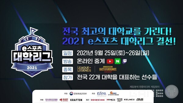 먼저 26일과 26일 올해 최고의 e스포츠 대학을 가리는 ‘2021 e스포츠 대학리그’ 결선이 광주 e스포츠 경기장에서 열린다. 문화체육관광부가 주최하고 한국e스포츠협회가 주관하는 이 대회는 올해 2회를 맞았다. 각 종목별 우승팀에는 문화체육관광부장관상 및 우승 트로피, 상금 200만원이 수여될 예정이다.