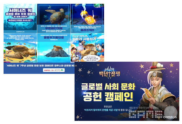 컴투스는 지난 7월 ‘서머너즈 워’ 세계 이용자들이 참여하는 공동 미션 이벤트를 완료하고, 글로벌 NGO환경재단에 기부금 5,000만 원을 전달했다. 후원금은 해양 생태계 보존 활동을 지원하는 데에 사용된다. 해안가에 떠밀려온 플라스틱 등 생활∙관광 쓰레기 저감 및 심해에 버려진 페그물∙통발 등을 제거하는 해양 환경 정화 작업을 진행한다.