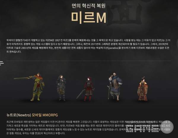 미르4의 뒤를 이를 신작은 '미르M'으로 '미르의 전설'의 모바일 버전이다. 기존의 미르2를 현대적으로 해석한 형태로 복원시키는 것이 목표이며, 뉴트로 모바일 MMORPG로 기존 미르2 이용자에게는 익숙함을, 신규 유저들에게는 정통의 게임성을 보여준다는 방침이다.