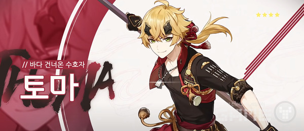 아울러 장병기를 사용하면서 불의 원소를 지닌 4성 캐릭터 ‘토마’가 공개됐다. ‘토마’는 강력한 방어력과 버프 능력을 보유하고 있어 믿을 수 있는 전투 동료로 꼽힌다.