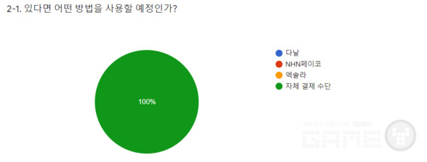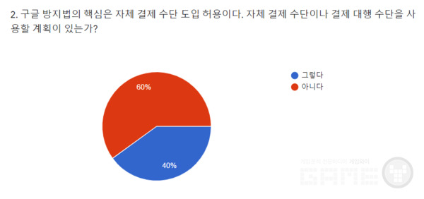 이어 구글 방지법의 도입에 따라 자체 결제 수단이나 결제 대행 수단을 사용할 계획이 있는지에 대해서는 총 3곳의 게임사가 '아니다'는 입장을 밝혔고, 2곳의 게임사가 '그렇다'고 답변했다. '그렇다'고 답한 2개의 게임사는 모두 '자체 결제 수단'을 사용할 예정이다.