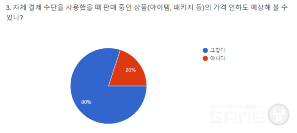 "자체 결제 수단을 사용했을 때 판매 중인 상품(아이템, 패키지 등)의 가격 인하도 예상해 볼 수 있나?" 라는 질문에는 총 4곳의 게임사가 '그렇다'고 답변했고, 다른 하나의 게임사가 '아니다'라고 답변했다. 표본이 적긴 하지만 시장에 유효한 영향력을 끼치는 대형 개발사들인 점을 고려했을 때, 이용자 입장에서 구글 방지법의 통과는 긍정적 효과를 가져올 것으로 보인다.