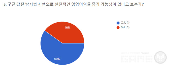 '구글 갑질 방지법이 추후 게임사에 미칠 영향이 있다고 보는가'에 대한 질문에 4곳의 게임사가 '그렇다'고 답변했고, 다른 2곳의 게임사는 '아니다'라고 답변했다.