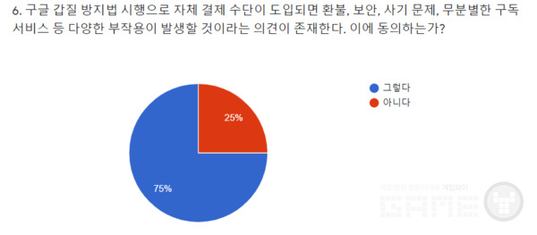 끝으로 구글 갑질 방지법 시행으로 자체 결제 수단이 도입되면 환불, 보안, 사기 문제, 무분별한 구독 서비스 등 다양한 부작용이 발생할 것이라는 의견이 존재한다. 이에 동의하는가? 라는 질문에는 총 3곳의 게임사가 '그렇다'고 답변했고, 1곳의 게임사가 '아니다'라고 답변했다.