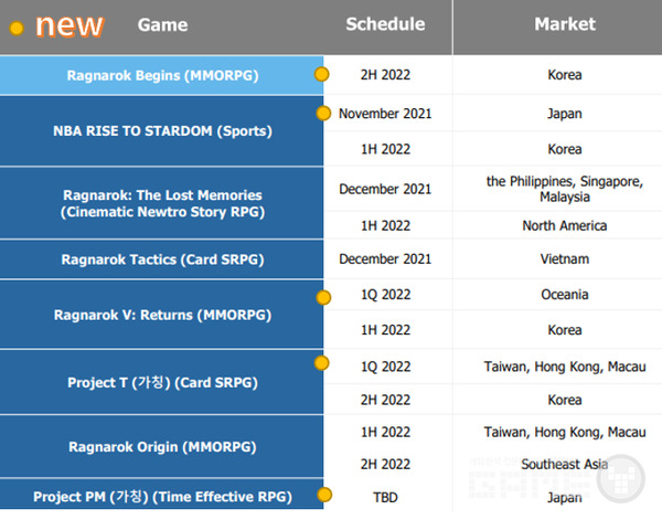 모바일 MMORPG '라그나로크V: 리턴즈'는 22년 1분기 오세아니아에 출시된다. 모바일 MMORPG '라그나로크 비긴즈'는 PC-모바일을 동시 지원하는 멀티플랫폼 서비스 준비 중이다. 지난 9월 한국 1차 CBT를 마쳤고, 출시일은 미정이다.