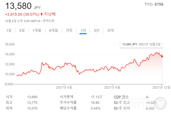 현재 소니의 주가는 13,580엔(한화 약 14만 원)에 거래되고 있다.
