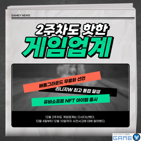 이번주는 크래프톤의 '배틀그라운드' 무료화 선언 소식과 유비소프트의 NFT 아이템 출시 소식이 주목받았습니다