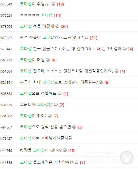 코다샵: -코다샵은 빠른 충전과 다양한 결제 방식, 게임에 대한 다양한 프로모션 및 이벤트를 제공하고 있다. 또한 로그인이나 멤버십 등록을 요구하지 않으며, 인게임 아이템을 다른 이용자에게 선물할 수 있다는 점이 코다샵의 주요 장점이다.