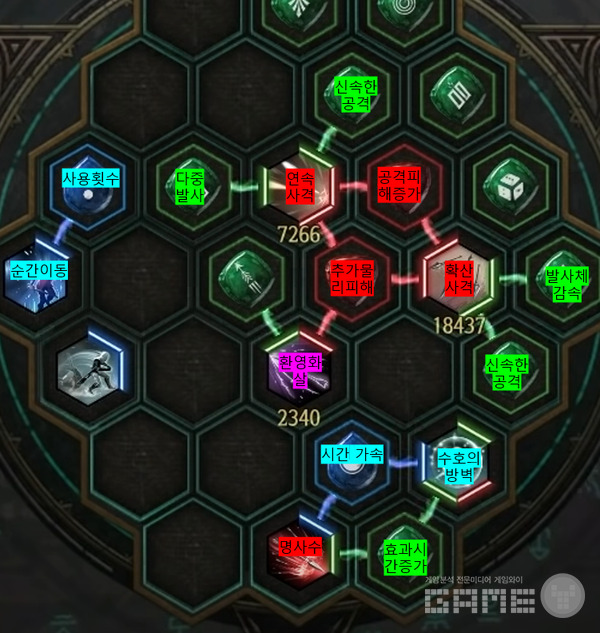 또 다른 유튜버인 나른겜은 확산사격과 연속사격을 메인으로 한 경우다. 그리고 여기에 환영화살을 추가했고, 이 외에 명사수와 수호의방벽, 순간이동 스킬을 사용 중이다. 연속사격에는 다중발사와 신속한공격, 그리고 추가물리피해와 공격피해 증가를 추가했다. 이 두 가지는 확산사격과도 연결했고, 신속한 공격도 같이 쓰인다. 다만 발사체 감속만 차이가 있다. 아래쪽에 수호의 방벽과 명사수에 시간가속과 효과시간을 연결시켜 4개를 동시에 사용하고 있다는 점이 돋보인다.