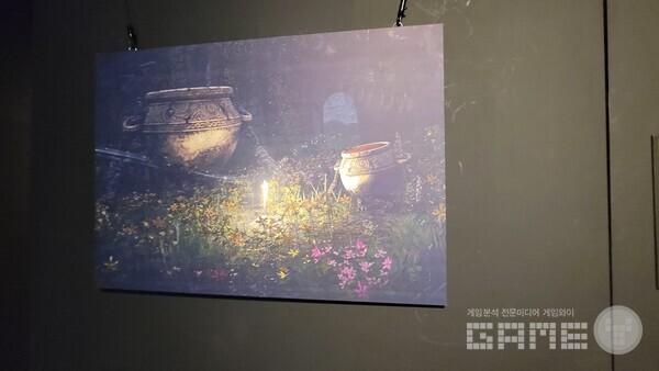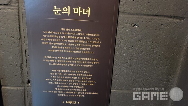 전시장은 크지는 않았지만 게임의 분위기를 온전히 느낄 수 있도록 검정색 배경의 벽지에 조명으로 그림이 돋보일 수 있도록 인테리어가 되어 있다. 전시장 메인에 있는 캐릭터와 검의 모형이 중심을 잡고 있다. 사진으로 전시장을 소개한다.