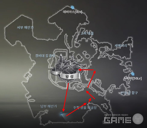우선 왕성 중앙 하단부로 빠져 나간다. 그리고 끝까지 직진한다. 그리고 좌회전, 지도를 보는 상태라면 오른쪽 방향으로 휜다. 그래서 채석장을 끼고 좌회전을 한다. 그리고 왕성을 들어갈 때는 동문으로 들어간다.