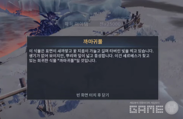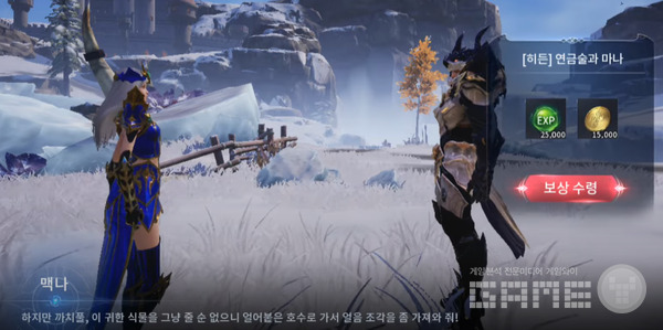 까치풀을 확인하면 저 멀리서 누가 뛰어온다. '맥나'라는 사람이고 이곳의 물건은 가져갈 수 없다고 한다. 그리고 세르베스라는 사람을 아는지 묻는다. 또 까치풀을 그냥 줄 수 없으니 얼어붙은 호수로 가서 얼음조각을 가져오라고 한다.