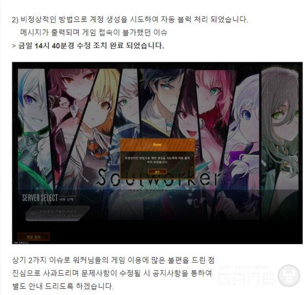 접속 관련해서는 오후 3시 30분 경 공지가 올라왔다. 운영지는 "접속 불가 현상이 수정됐고, '비정상적인 방법으로 계정 생성을 시도하여 자동 블럭 처리됐다'는 메시지가 나타나는 현상도 수정됐다"고 밝혔다. 남은 것은 캐릭터가 사라졌다는 부분이다. 관련해서는 라이언게임즈에 문의를 해 둔 상태다.