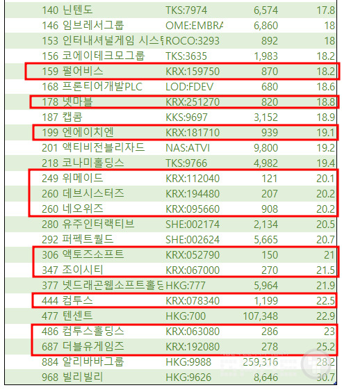 다른 국내 게임사는 24위부터 50위권에 집중되어 있다. 펄어비스는 국내 기업 중에서는 엔씨와 넥슨, 웹젠에 이어 4위를 차지했고, 이어 넷마블과 NHN 등의 대형 기업은 코에이, 블리자즈, 캡콤 등의 일본 및 글로벌 대형 기업과 비슷한 수준을 보였다.