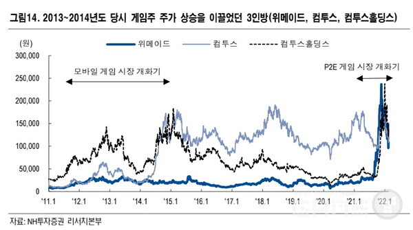 2012년 모바일게임 시장과 2022년 P2E게임 시장을 주도하고 있는 게임사가 공교롭게도 위메이드, 컴투스, 컴투스홀딩스(구 게임빌)라는 점에서다. 피처폰 1, 2위였던 게임빌 컴투스는 모바일게임 시장에 잘 적응했고, 위메이드도 PC게임을 모바일에 잘 이식하여 주가가 크게 상승했다. 하지만 시장은 4년후인 2016년 리니지레볼루션이 등장하면서 본격적으로 성장했다.