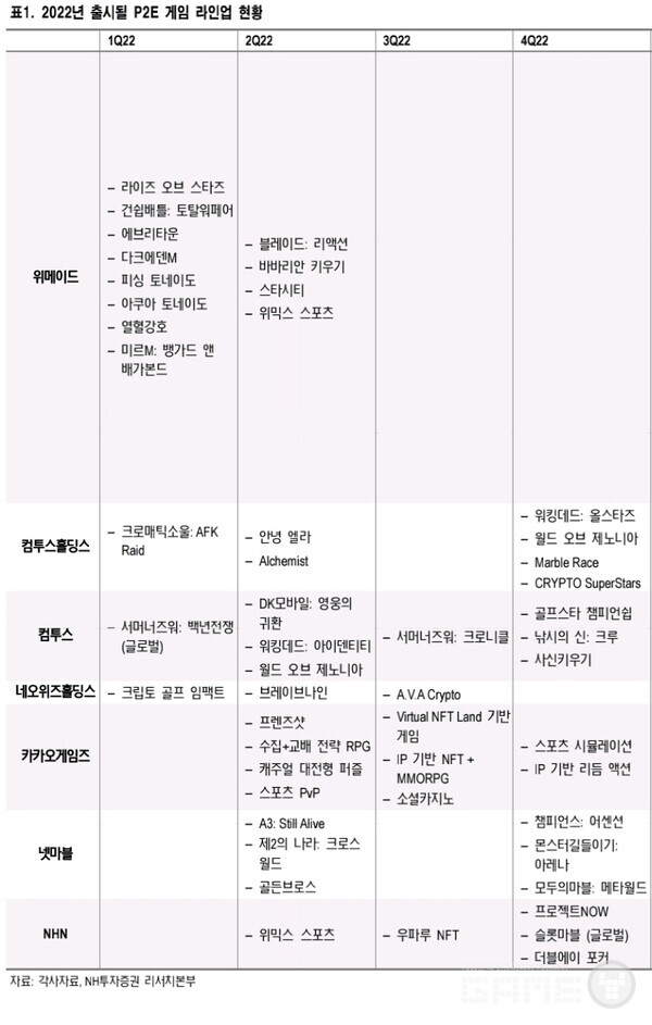최근 핫한 이슈인 P2E와 관련해서는 2021년에는 P2E 시장과 암호화페에 대한 막연한 기대로 주가가 상승했다면, 지금부터는 출시 게임의 성과와 비즈니스 모델의 확장성 및 안정성에 기반한 기업의 주가가 오를 것으로 봤다. 또 2분기부터 출시되는 P2E 신작들이 성과를 내는 기업들을 중심으로 주가가 오를 것이라고 전망했다.