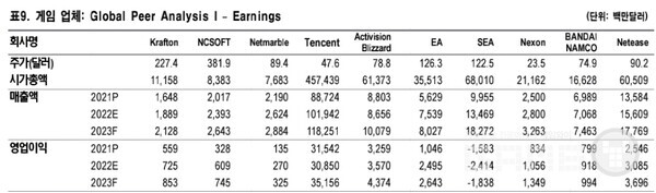 하지만 게임사별로 목표주가 의견은 엇갈렸다. 크래프톤과 엔씨소프트, 네오위즈, 웹젠, NHN의 5개 게임사는 목표주가를 하향했다. 또 목표주가를 상향한 곳은 펄어비스와 컴투스, 컴투스홀딩스였다.