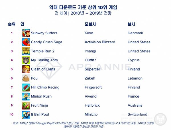 2019년 앱애니가 발표한 역대 전세계 누적 다운로드 1위 모바일게임 발표 자료에 따르면 모바일게임은 서브웨이서퍼였다. 2012년부터 구글플레이와 애플 데이터 합산 기준이고, 이전 데이터는 iOS 데이터만 포함됐다.