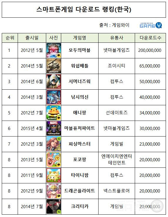 한편 글로벌로는 앵그리버드 시리즈가 20억을 기록한 것으로 알려져 있으며, 시리즈가 아닌 단품으로는 서브웨이 서퍼가 세계 1위다.