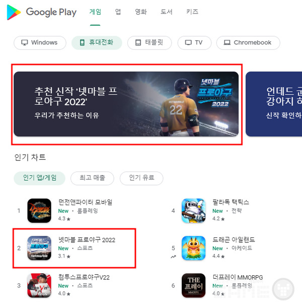 넷마블 야구는 구글 2위, 컴투스 야구22는 구글 3위로 치열한 경쟁을 벌이고 있다.