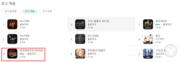 출시 15일차인 던파 모바일은 지난25일 출시 이후 2일과 3일 구글플레이 스토어에서 리니지W를 제치고 1위를 차지한 바 있다. 이후 3위를 계속 유지 중이다.