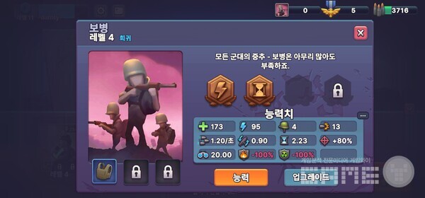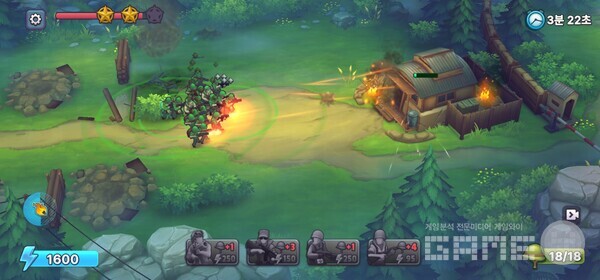 건즈업도 마찬가지다. 유닛에 따른 차이는 크게 느끼지 못했다. 아마도 그것은 항상 이기는 게임이었기 때문에 그럴 수도 있다. 그래서 재미있다. 자금이 허락하는 한도 내에서 조금만 업그레이드를 해줘도 공격을 하는 것은 언제나 백전백승이다. 빠른 시간 안에 승리를 하면 3성으로 통과를 할 수 있는데, 이것이 스테이지 방식이 아니라 실제 이용자의 기지를 쳐들어가는 것이다.