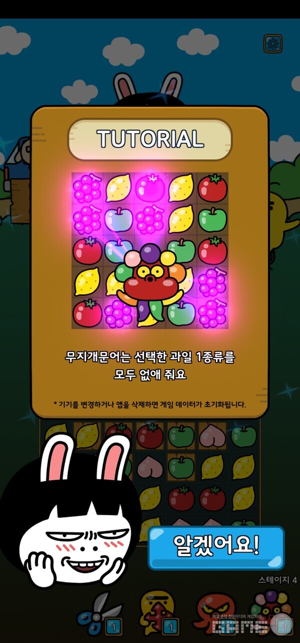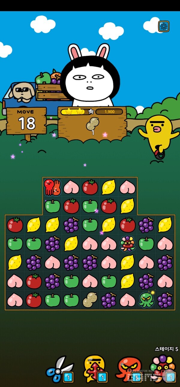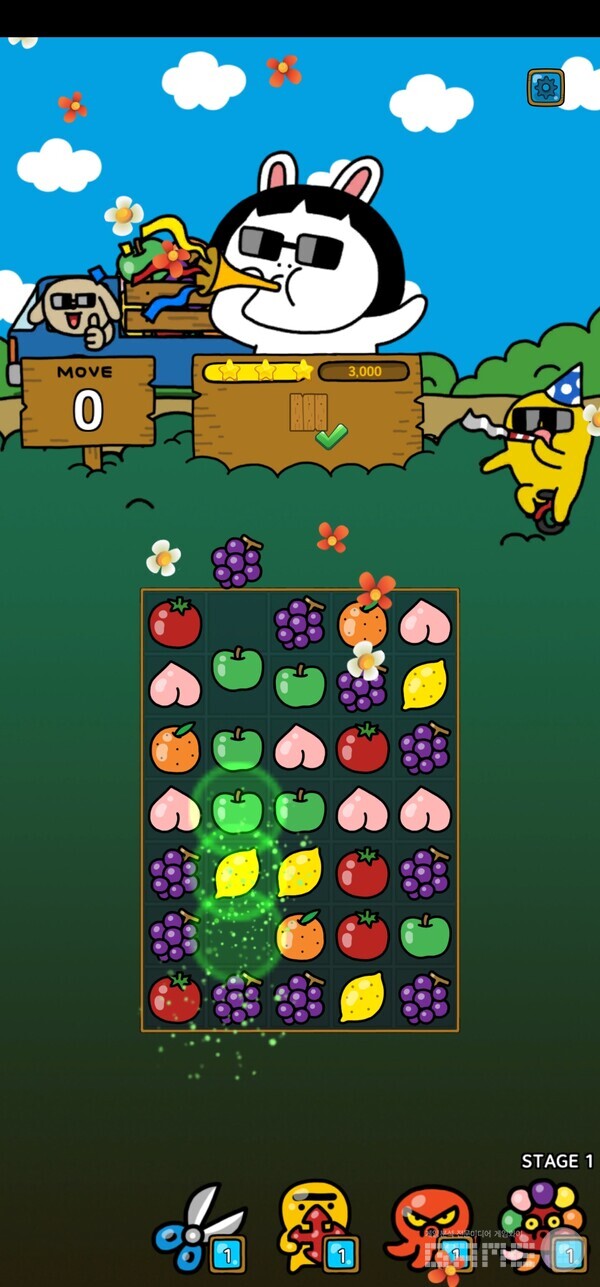 게임은 기본이다. 3매치 퍼즐게임의 대명사처럼 여겨지는 캔디사가와 같은 번쩍거리는 효과는 없다. 다만 과일 퍼즐을 절제감 있게 잘 표현했다. 조금 부족한 부분이 있어도 호조 캐릭터 아이콘의 유머와 익살이 메꾼다.