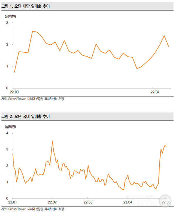 미래에셋은 6월 출시되는 우마무스메의 연타석 흥행이 더해진 후 카카오게임즈의 주가가 본격적인 반등을 시작할 것이라고 봤다. 또 오딘 대만이 시장 기대치를 대폭 상회하는 10억 원대 후반의 일매출 성과를 기록중임에도 오버행, 라이온하트 상장 등 이슈로 한 달간 주가 25% 하락했다고 분석했다.