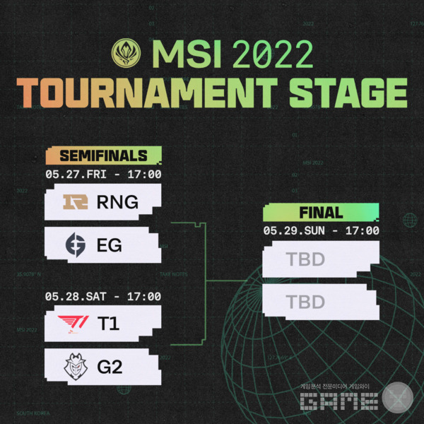 럼블 스테이지 1위인 RNG에게는 준결승 상대방과 경기일을 선택할 수 있는 권한이 주어졌다. 그 결과 RNG는 27일(금) 오후 5시 이블 지니어스와 5전제 경기를 치른다. 럼블 스테이지에서 G2 e스포츠에게 일격을 당한 바 있는 RNG 입장에서는 당연한 선택으로 보인다. 이에 따라 T1은 28일(토) 오후 5시 유럽 대표 G2 e스포츠와 MSI 결승 티켓을 놓고 대결한다.
