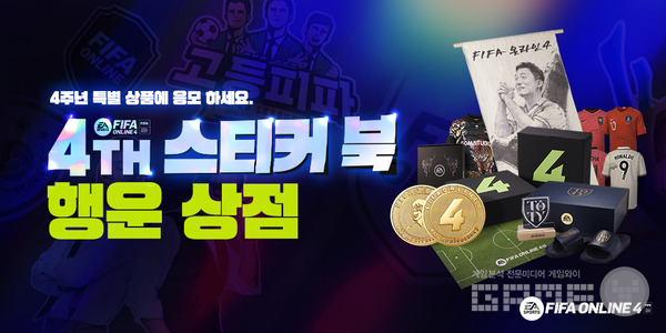 먼저 7월 6일까지 4주년 스티커북 행운 상점을 운영한다. 상점에서는 4주년 스티커북 페이지를 완성하고 모은 응모권으로 원하는 굿즈에 응모할 수 있다. 응모자 중 추첨을 통해 정무도, 4주년 기념 주화, 축구장 모양의 장패드, 샷건 쿠션, 각종 축구선수 사인 유니폼, XBOX패드, 베컴 장패드 등 풍성한 경품을 제공한다. 정무도는 동양화 및 한국화 화가 신영훈이 ‘FIFA 온라인 4’ 사업을 총괄하는 넥슨 박정무 그룹장에 영감을 받아 그린 것으로, 마음의 평화와 행운, 즐거움의 의미를 담고 있다.