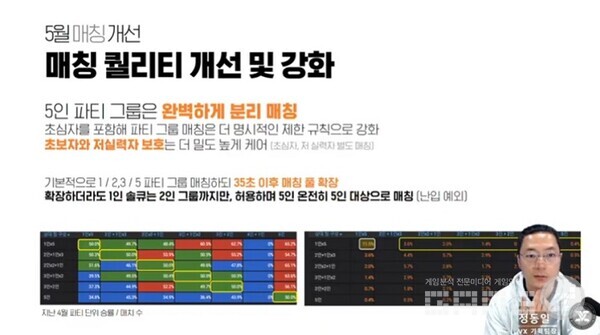 4월 중 진행된 테스트에 대한 리뷰도 진행됐다. 초보자 그룹을 분리하는 매칭과 최대한 비슷한 실력의 유저 간 매칭, 1인/ 2~3인/ 5인을 분리하는 매칭 등 로직에 대한 변경이 적용됐으며, 신규 유저 매칭과 파티 분리 매칭에 대해서는 의미있는 성과가 있었다.