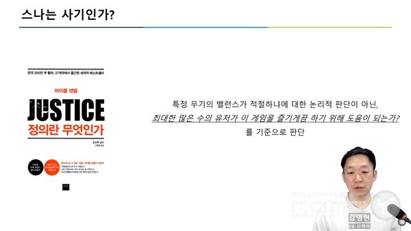 김 디렉터는 밸런스를 논하기 앞서 개발팀과 유저가 토론하는 문화에 대해 "개발팀이 이 토론을 이끌어 나가는 주체는 맞다. 분명 시각이 다른 의견을 보면 비판적인 의견이 오갈 수도 있을 것이다. 개인적으로 나쁘다고 생각하진 않으나 분쟁이 많아지면 변질될 가능성이 높다. 싸워서 이겨도 그 의견이 그대로 반영되는 것도 아니기에 의견이 있으면 개발팀에게 전달하는 방향으로 토론 문화가 발전했으면 좋겠다"고 소감을 전했다.