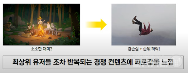 또한, 경쟁과 PvP는 큰 재미를 선사하는 대신 큰 피로감을 주기도 한다. 이러한 피로감을 줄여줄 생활 콘텐츠는 경쟁 플레이와 상충한다. 예를 들어 모닥불에서 지인들과 놀고 있는 상황에서 내 경쟁자가 사냥한다면 곧바로 경험치와 아이템의 손실로 연결되는 구조인 것.