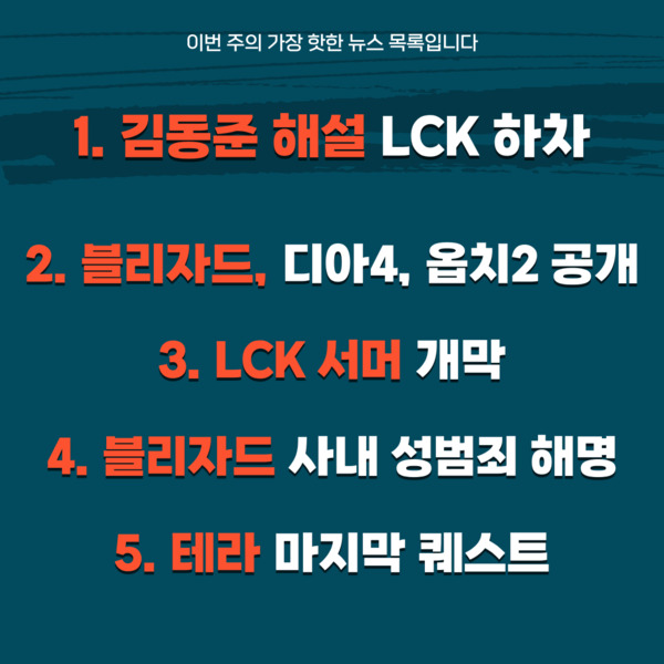 이번 주는 김동준 해설의 LCK 하차 소식과 블리자드의 기대작 디아블로4, 오버워치2의 출시일 발표 소식이 주목받았습니다