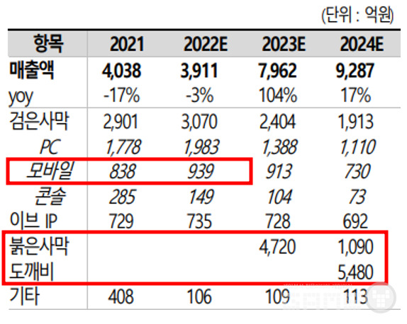 펄어비스 관계사 빅게임스튜디오는 2022년 하반기 '블랙 클로버'라는 신작 타이틀을 출시한다. 블랙 클로버는 유명 일본 애니메이션 기반 모바일 수집형 RPG다. 모바일 플랫폼 매출은 2021년 838억 원으로, 2022년 예상 매출은 939억 원이다. 차이는 101억 원이다. 출시가 확정된 펄어비스 타이틀은 '붉은사막'과 '도깨비', '블랙 클로버'다. 모바일에서 별 다른 이슈가 없다면 '블랙 클로버'의 2022년 매출은 약 100억 원이 된다.