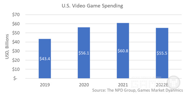 미국 시장조사업체 NPD 그룹(NPD Group)은 2022년 미국 게임 지출이 555억 달러로 전년대비 8.7% 감소할 것이라고 예측했다. 이같은 지출 감소의 원인으로 팬데믹 종식으로 인한 여가활동의 재개, 식품 및 연료 등 일상재 가격의 인상, 비디오 게임 콘솔 및 악세사리 등 하드웨어의 공급망 불안정성, 신작의 감소 등을 꼽았다.