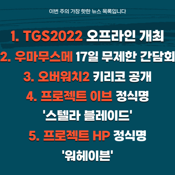 이번 주는 세계 3대 게임쇼 TGS 2022의 개막소식과 운영 논란에 휘말렸던 카카오게임즈의 '우마무스메' 간담회 개최 소식이 주목받았습니다