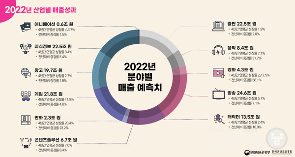 매출 규모는 전년 대비 모든 산업들이 증가했다. 상대적으로 높은 성장을 보인 것은 음악, 만화, 캐릭터였다. 4년간 성장률 기준으로 보면 게임과 만화가 가장 크게 성장했다. 2022년 게임 분야 매출 예측치는 약 21.8조 원으로 예측됐다. 코로나 시기에 이용률이 급격하게 늘어난 것이 성장의 이유다.