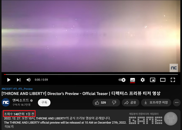 엔씨의 신작 게임 '쓰론앤리버티(THRONE AND LIBERTY)' 디렉터즈 프리뷰 티저 영상 조회수가 단 하루 만에 '140만'을 돌파했다. 이 영상은 21일 오전 11시를 넘어서면서 139만에서 140만을 찍었다.