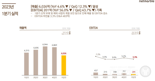 11일 넷마블이 컨퍼런스 콜을 통해 2023년 1분기 실적을 공개했다. 이날 자리에는 권영식 대표, 도기욱 대표, 이승원 글로벌 부분 대표가 참석하여 2023년에 출시될 게임들과 1분기 매출 실적에 대해 설명했다.